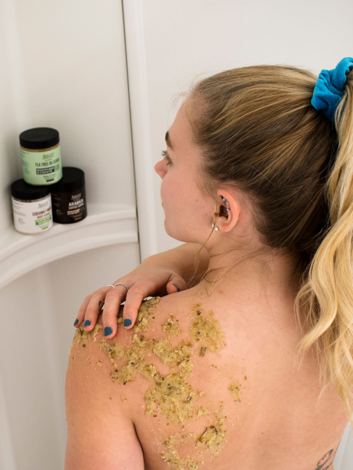 Massage Belenora Matcha Body Scrub onto damp skin using circular motions.